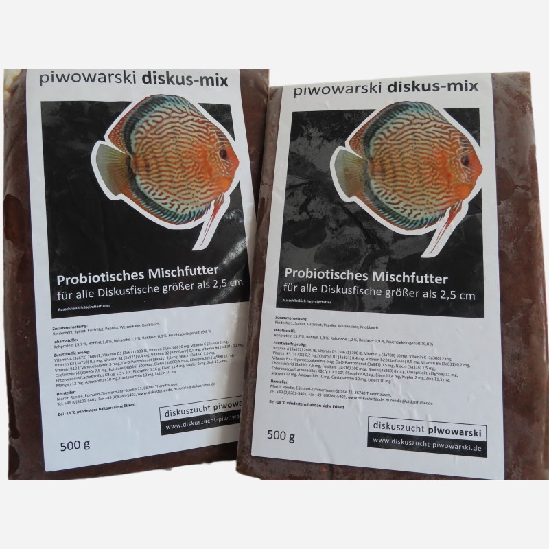 Piwowarski’s discus mix is a probiotic frozen food for all discus fish from 2.5 cm onwards. A mix of beef heart, fish fillet and spinach, supplemented with probiotics, many important vitamins and minerals. Your fish will gladly eat it.