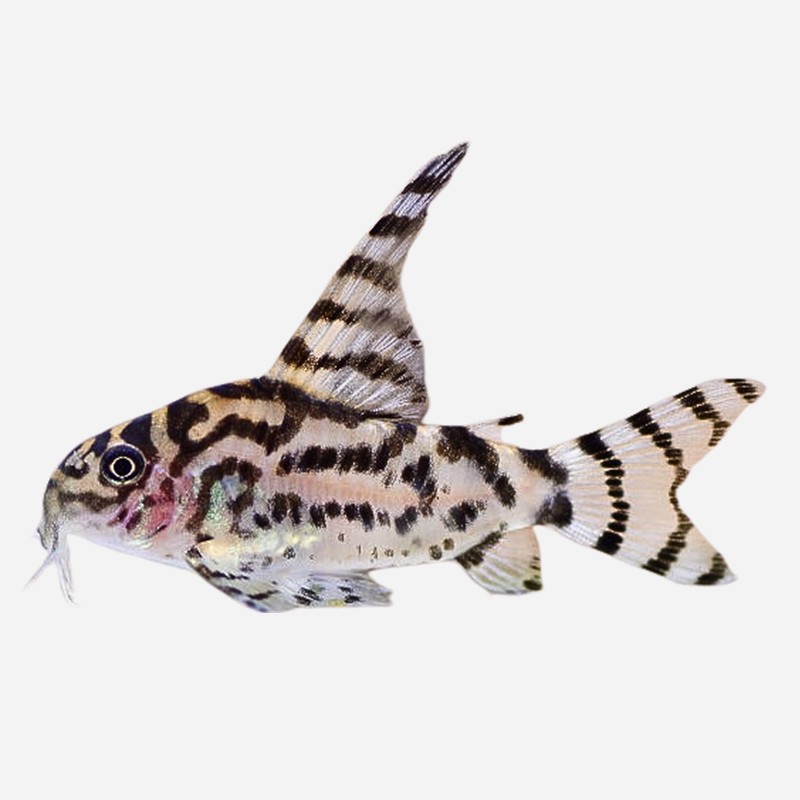The Corydoras sp CW111 / Zebra High Fin corydoras is an extremely rare fish and is hardly ever available in the aquarium trade. Unique in beauty and contrast, with a white body and contrasting black stripes in a zebra pattern. The males develop the characteristic high fin. They grow to a size of approximately 7 cm. Now available in two different sizes.